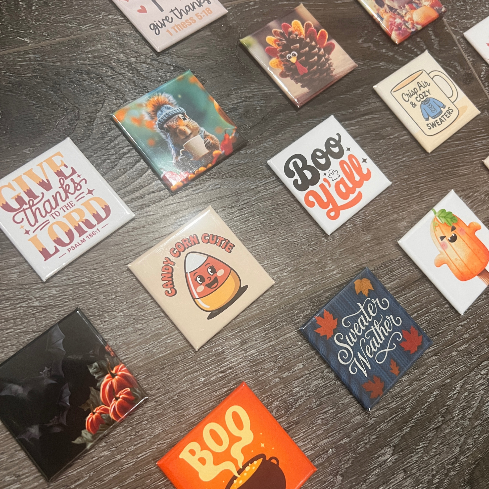 Capture the beauty of fall with our Custom Fall Magnet Collection. Choose from a variety of autumn-inspired designs—pumpkins, leaves, Halloween, and Thanksgiving—and create your own custom set of 9 premium 2x2 photo magnets.